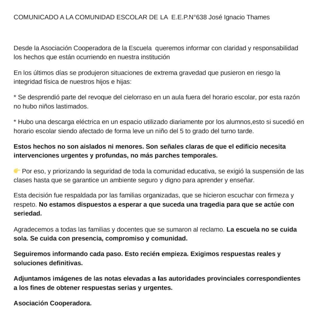 La situación en la Escuela Thames de Charata ha llegado a un punto crítico que no puede ser ignorado. Un grupo de padres, preocupados por las condiciones de infraestructura de la institución, se ha presentado ante los medios locales para exigir respuestas después de un incidente alarmante: un alumno sufrió una descarga eléctrica al tocar una pared.