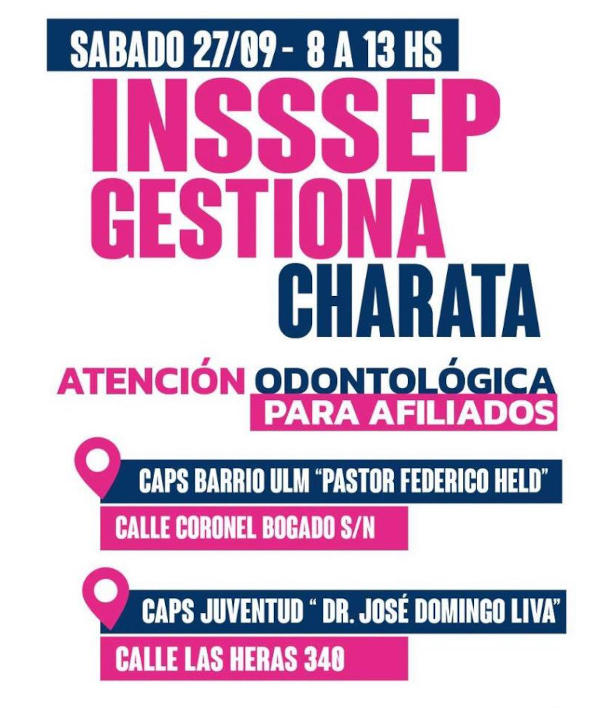 El Instituto de Seguridad Social, Seguros y Préstamos (INSSSEP) realizará una jornada especial de atención odontológica para sus afiliados en la localidad de Charata, en el marco de su programa "INSSSEP Gestiona". La iniciativa busca acercar los servicios del organismo a la comunidad, facilitando el acceso a prestaciones esenciales.