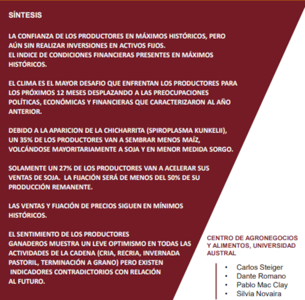 La encuesta a productores toma respuestas de 406 productores cuyo valor bruto de producción es igual o mayor a 200.000 dólares. El Índice de Expectativas Futuras, con un valor de 171, también es el máximo de la historia.