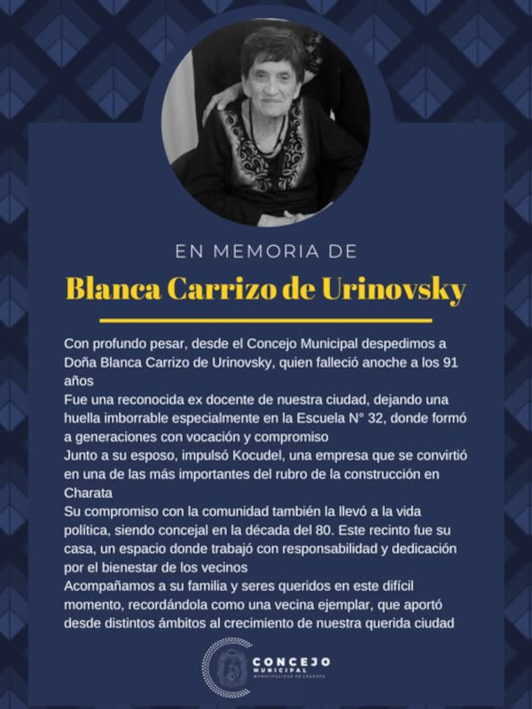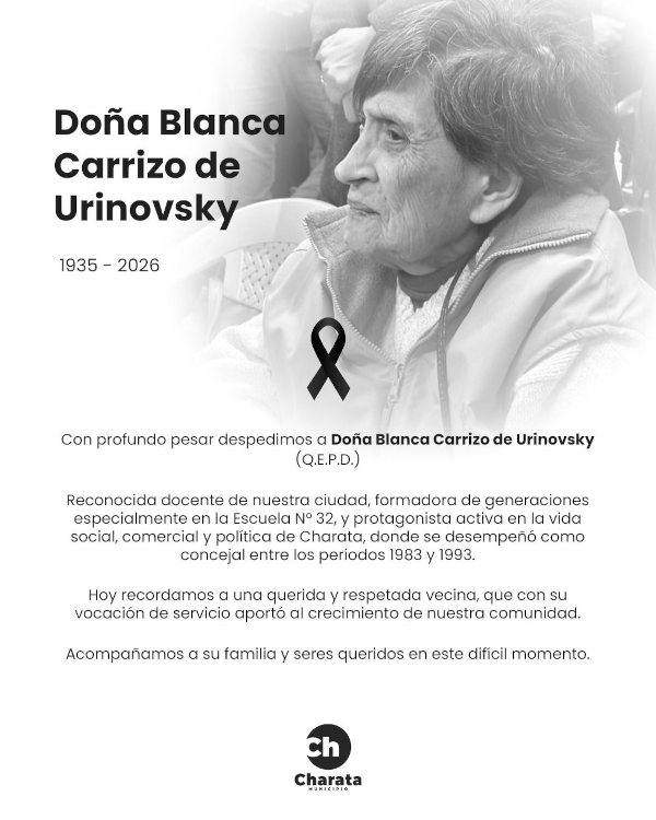 Blanca Carrizo de Urinovsky deja un vacío irremplazable, pero su legado, basado en el trabajo, la ética y el compromiso social, perdurará en la historia de Charata. Su vida y su obra seguirán inspirando a futuras generaciones, consolidando su lugar en el corazón de la comunidad.