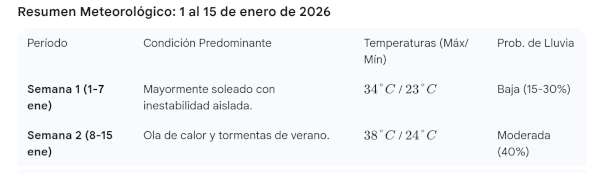 Nota de cautela: Si bien el pronóstico indica menos días de lluvia, la tendencia para enero 2026 muestra que las precipitaciones, cuando ocurren, pueden ser puntualmente fuertes debido al alto calor acumulado.